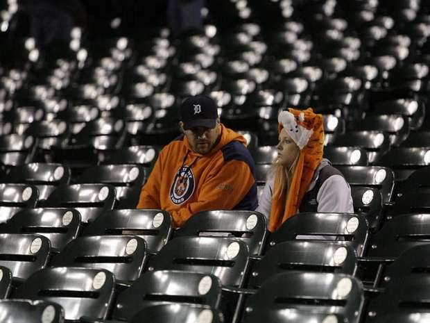 (L to R) Derek Lynch, 34, and girlfriend Blake Lindsay, 19, both of Indianapolis sit in an emptied out section of Comerica Park after Game 4 of the American League Championship Series between the Detroit Tigers and the New York Yankees was postponed because of rain. The two drove up Tuesday and were excited to be at Game 4 in Detroit on Wednesday, Oct 17, 2012.